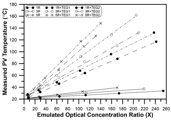Increasing the area of the presumed PV cells on top of the TEGs (that were replaced by heating elements in this study) resulted in a greater increase in the overall system temperature compared to that of a system whose PV cells were in direct thermal contact with the heat sink only (without any intermediate TEG). This increase in temperature reduced the electrical output power of the PV cells. Such a reduction in the PV electrical output was subsidized by the electrical power generated by the TEG. The PV cells’ temperature (represented by the temperature of the heating elements) was measured at different emulated optical concentration ratios and plotted in Figure 6. In this figure, 1R represents a CPV/TEG system with one PV cell (i.e., one heating element) attached on top of it, and 3R represents a CPV/TEG system with three PV cells attached, and so on. The number of heating elements placed on the TEG was then increased one by one, and the temperature of the hot surface representing the PV cells was measured at each step. Heating elements connected to the heat sink only (without TEGs) showed the lowest temperatures compared to those connected to either of the TEG modules. This was because there were no intermediate objects between the heating elements and the heat sink (except for a thin layer of thermal grease to increase thermal conductivity). Hence, such a configuration had better heat dissipation. Introducing TEG elements resulted in an expected rising system temperature (because of the TEG thermal resistances), hence reducing the electric output power of the proposed PV cells accordingly, as will be discussed later.