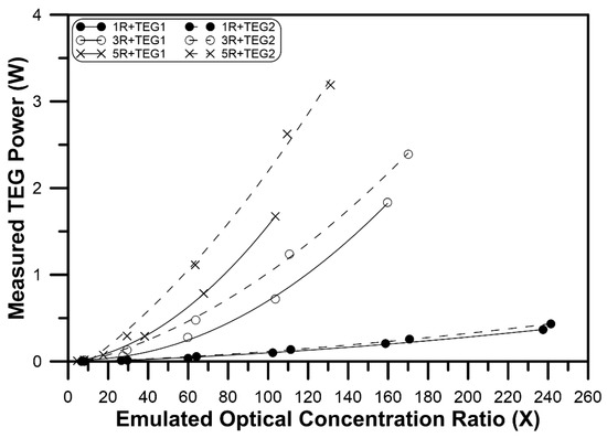The electrical power generated in both TEG modules as a function of the emulated optical concentration ratio was measured with a load resistance equal to the internal resistance for each of the TEG modules that were tested (listed in Table 1). Figure 7 shows that the generated power reached about 2.4 W and 3.2 W at a 32.5% coverage area (i.e., using five heating elements) for TEG1 and TEG2, respectively, under a concentrated solar radiation of 130X.