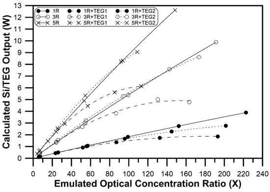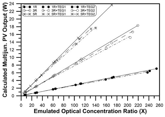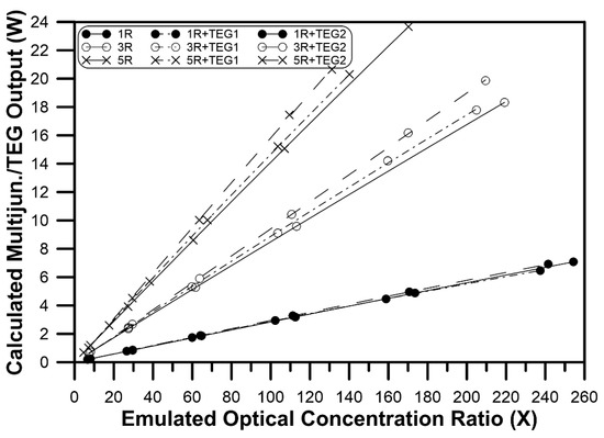 Multijunction cells coupled to a TEG total system output power (output of the PV cells plus output of the TEG module) is shown in Figure 10. A minimal difference was predicted for the PV/TEG in the case of only one cell attached to either of the TEGs (symbolled “1R+TEG1” and “1R+TEG2” in Figure 10) compared to that of the cells attached directly to the heat sink (labelled 1R in the same graph). Increasing the number of cells on top of the TEGs enhanced the total electrical output of the PV/TEG system. Increases of about 3% and 12% for the multijunction PV/TEG1 and the PV/TEG2 systems, respectively, were predicted compared to that of a PV-only system.
