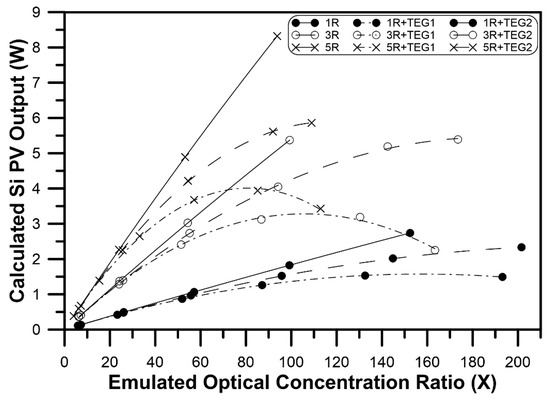 Figure 4 shows the temperature difference between the hot and cold surfaces of the TEG with increasing numbers of heating elements, from which the percentage area of the heated surface to the total TEG hot surface area was calculated. The radiation intensity could be expressed in terms of an emulated optical concentration ratio X, assuming that a radiation intensity incident on the surface of the Fresnel lens of 1000 W/m2 is equivalent to 1X. The maximum percentage of the covered area was 32.5% of the total TEG hot surface area using five heating elements. Increasing the covered area beyond 32.5% of the total TEG upper surface resulted in temperature levels beyond the values recommended by the manufacturers of both TEGs.