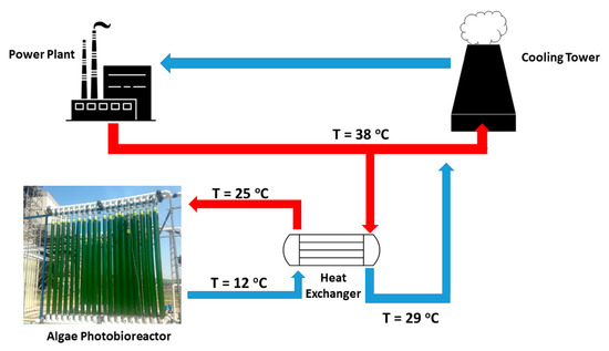 Process flow diagram for heat exchanger used to heat algae cultures from 12 °C to 25 °C. A slipstream of water that circulates from the power plant to the cooling towers is simultaneously cooled from 38 °C to 29 °C.
