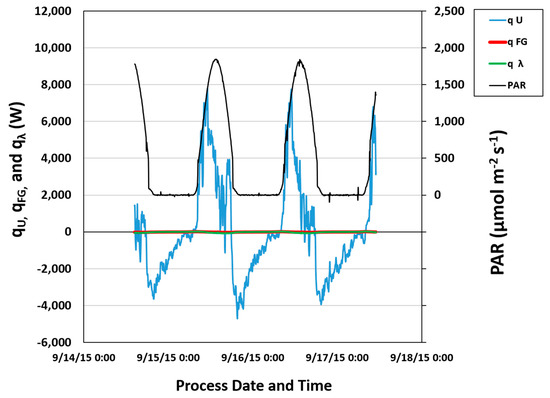 Heat contributions to the cyclic flow PBR and photosynthetically active radiation (PAR) vs. time. All values are reported as thermal energy in watts (W). PAR is a measurement of solar radiation and is reported as a photon flux in µmol m−2 s−1.