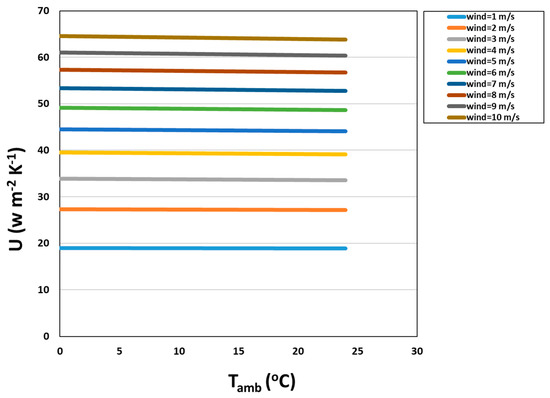 U (W m−2 K−1) vs. ambient temperature at a range of wind speeds.