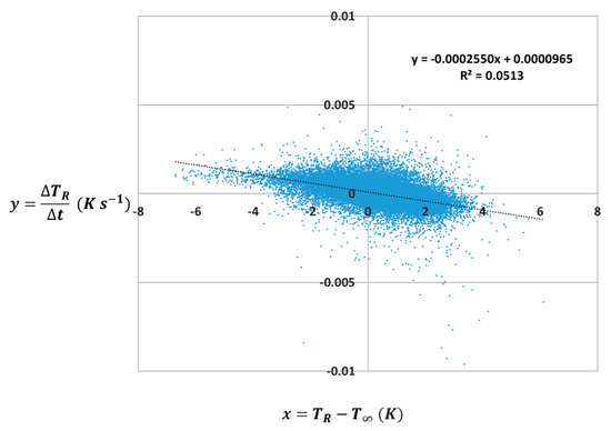 On the basis of the slope in Figure 8, Equation (7) was used to extrapolate an overall heat transfer coefficient of 24.8 W m−2 K−1 using a reactor surface area of 48.9 m2, an assumed internal reactor mass of 1136 kg, and a heat capacity of 4180 J kg−1 K−1. This value for U (W m−2 K−1) provided by the data-based model is well within the range of 19–64 W m−2 K−1 supplied by the tabulated model and is extremely close to the overall heat transfer coefficient provided by the tabulated model of 22.2 W m−2 K−1 at a wind speed of 1.36 m s−1.