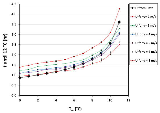 Time-temperature tables [32] were used to interpolate cooling times for the tabulated model at a range of wind speeds as shown in Figure 9. Cooling times associated with the data-based model were calculated using ambient temperatures () and wind speeds at ranges of respectively 0–12 °C and 2–8 m s−1. From this follows that all of the calculated cooling times are less than that of the standard PBR cycle time of 6 h.