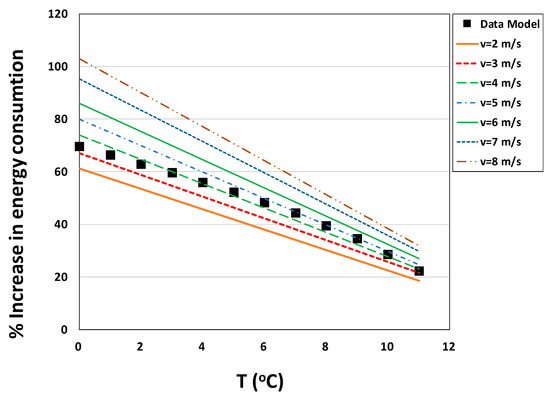 As shown in Figure 10, the percent increase in system energy consumption ranges from 18%–103% at the given wind speed and temperature. One important factor to note is that solar gain is not accounted for in the tabulated model, hence it is not accounted for in the corresponding plots shown in Figure 10. However, actual solar gain is implicit in the data collected at the East Bend Station used in creating the second model. Despite these stark differences in method, both models produced strikingly similar sets of heat transfer coefficients. This implies that one could use the lines in Figure 9, contributed by the tabulated model, as a metric for increased energy use for any PBR in colder climates. If need be, a short dataset of PBR and ambient temperatures could be collected at potential site locations to provide the data needed to make a data-based model for verification.