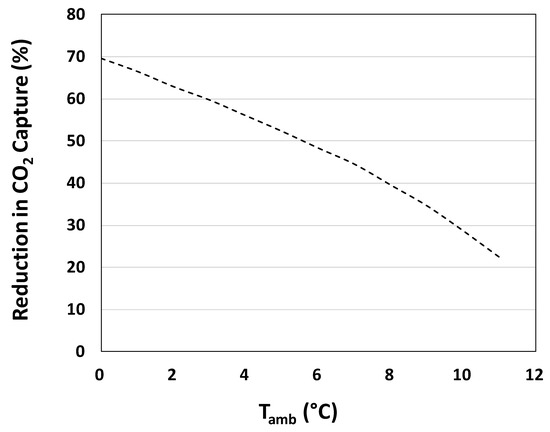 Reduction in overall CO2 capture vs. ambient temperature for a photobioreactor with operating heat integration equipment. Reduction in CO2 capture values are instantaneous energy penalties associated with the operation of heat integration equipment and calculated using the overall heat transfer coefficient derived from the data-based model.