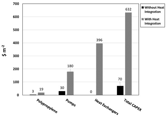 Capital expenditures (CAPEX) for a PBR system with and without installed heat integration equipment. Both PBR systems were sized for a 1 MW power plant. Capital costs ($ m−2) were calculated assuming a baseline production cost of $70 m−2, which includes the cost of equipment.