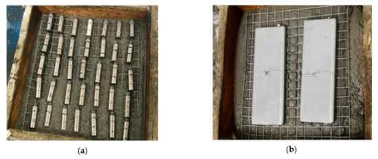 The first step was filling the macro capsules with RT31 paraffin in liquid form. After filling, epoxy adhesive was applied to seal the opening of capsules. Then, the macro capsules were tied to a layer of wire mesh before being inserted into the mortar mix to ensure uniform distribution in the middle of the mortar panels. The mortar mix used in this study adopted a cement to sand ratio of 1:4, while the water cement ratio was 0.5. The cement used was ordinary Portland cement (OPC) type I with a specific gravity of 3.14 g/cm3. The dimensions of mortar panels were 200 mm × 200 mm × 50 mm. The mortar mix was first filled up to the mid-height of timber molds and then compacted properly. Macro capsules (attached to the wire meshes) were placed on top of the compacted mortar mix, as shown in Figure 1. After that, mortar was placed and compacted to achieve a depth of 50 mm for the mortar panels. The mortar panels were cured in water for 28 days before testing. The total volume of the PCM was approximately 3% of the panel volume. Two mortar panels without the PCM were used as control samples. Two panel replicates were prepared for each type of macro capsules, resulting in a total of 6 panels tested.
