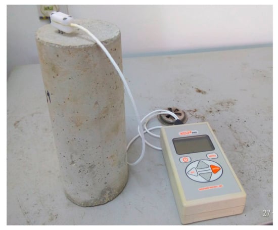 KD2Pro thermal properties analyzer (ICT International, Armidale, Australia) is a portable device designed to measure thermal properties, such as thermal conductivity, thermal resistivity, thermal diffusivity, and specific heat. In this study, the thermal conductivity and specific heat of the mortar mix were measured by using the SH-1 probe (which is capable of measuring volumetric hear capacity, thermal diffusivity, thermal conductivity, and thermal resistivity). Three mortar cylinders with a diameter of 100 mm and a height of 200 mm were prepared using the described mix proportion. The measurement was taken by inserting the probe into the mortar cylinder, as illustrated in Figure 2. After each measurement, the device was allowed to equilibrate with the ambient temperature for 15 minutes. The thermal conductivities of the samples were 1.02 W/(m·K), 1.12 W/(m·K) and 1.17 W/(m·K). The specific heats of the samples were 1240.5 J/(kg·K), 1258.6 J/(kg·K) and 1250.2 J/(kg·K). The average thermal conductivity of the mortar mix was 1.1 W/(m·K), while the average specific heat was 1250 J/(kg·K).