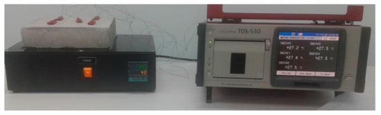 To study the thermal behavior of mortar panels with different forms of macro encapsulated PCMs, an instrumented hot place device was setup using a hotplate, five thermocouples, and a data logger. The mortar panels were placed on top of the hot plate set at 40 °C, and the temperature at the top surface was monitored by thermocouples connected to a data logger, as shown in Figure 3. The setup resulted in a one-dimensional heat transfer from the bottom surface to the top surface of the mortar panels by conduction. The tests were conducted in a room with the temperature controlled at 27 ± 0.5 °C during the testing. Once the panels achieved the steady state, testing was terminated.