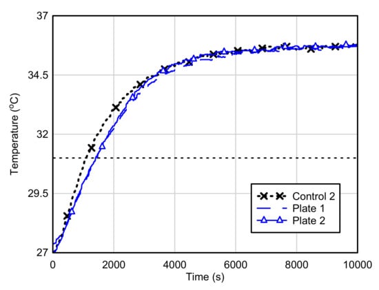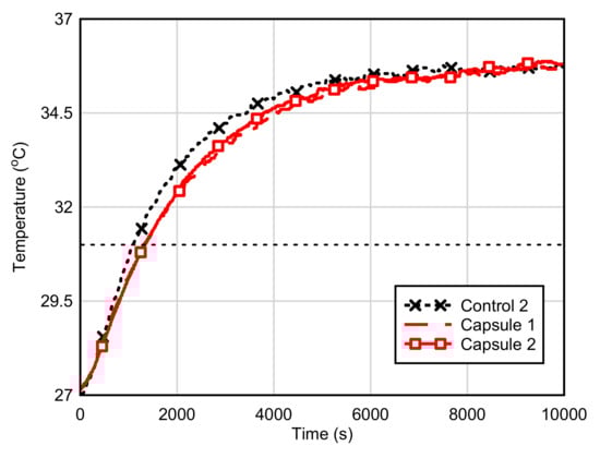 The average experimental top surface temperature of Control Panel 2 and panels with paraffin encapsulated in steel capsules are illustrated in Figure 4. The thickness of Control Panel 1 was only 45 mm, 5 mm less than other panels. This made the temperature increase of Control Panel 1 noticeably higher than that of Control Panel 2—as expected. Therefore, the results of Panel 1 were discarded from further analyses. Control Panel 2 reached steady state after around 7000 s, with a final temperature of 35.7 °C. In comparison, the panels with paraffin in steel capsules showed lower temperatures compared to Control Panel 2 during the transient state, starting from 500 to 6000 s. This is in accordance with published literature []. The maximum temperature difference was about 0.7 °C for both samples when compared to Control Panel 2 at around 2000 s, as summarized in Table 2. The lower temperature was attributed to the heat absorbed by the paraffin during phase transition. The panels with macro-encapsulated paraffin showed a time lag of reaching 33 °C at around 400 to 500 s. The panels with paraffin in steel capsules reached the final temperature later than Control Panel 2, at approximately 8000 s. The results suggest that the addition of steel capsules containing the paraffin can retard the temperature increase of concrete because of the heat absorbed by the paraffin during the solid-to-liquid phase change.