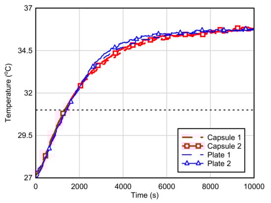 The samples with paraffin in steel panels demonstrated a lower temperature from 500 to 4000 s compared to Control Panel 2, as illustrated in Figure 5. A maximum temperature difference of about 0.9 °C was observed at about 1400 s. After 4000 s, the samples with paraffin in steel panels demonstrated a similar thermal response with Control Panel 2. Figure 6 shows the comparison of thermal response for the samples with both forms of macro capsules used in this study. It could be observed that the overall response was similar for both forms of macro capsules. Minor differences could be observed, as the samples with steel panels demonstrated a lower temperature before 2000 s and then a higher temperature between 2000 to 6000 s compared to the samples with paraffin in steel capsules. This may be attributed to the higher amount of steel in the mortar panel containing steel panel, since steel has a higher heat transfer capacity than mortar. The experimental results revealed that paraffin encapsulated in both forms of macro capsule demonstrated similar thermal responses.