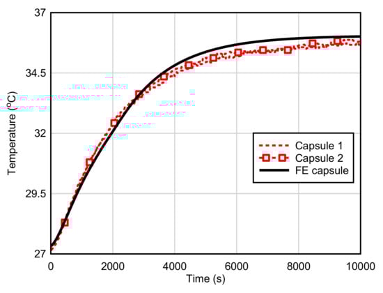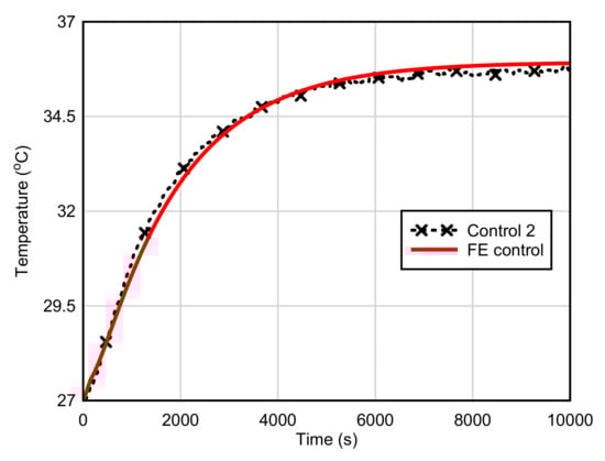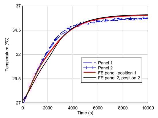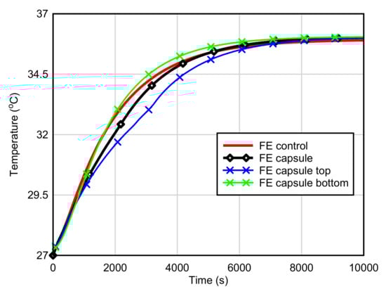 The control mortar panel (i.e., without PCM macro-capsules) was used to validate the FE model. The predicted temperature time history of the control panel is illustrated in Figure 7. It showed an excellent match with the experimental results of Control Panel 2. The predicted final temperature was 35.9 °C, which was 0.2 °C higher than the experimental results. This showed that the FE model was capable of predicting the thermal response of the mortar panel using the input parameters defined in this study.