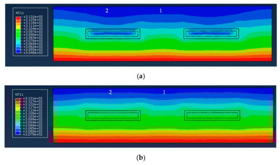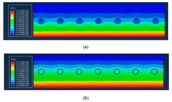 FE-predicted temperature distribution across the panel with paraffin in steel capsules. (a) Paraffin started to melt at 29 °C (302 K), and (b) paraffin fully melted at 33 °C (306 K).