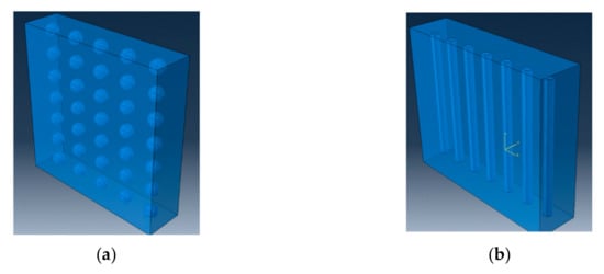 FE models with different form of macro capsules; (a) spheres and (b) pipes.