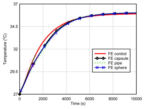 Figure 13 shows that the overall response of panels incorporated with different forms of macro capsules was similar. When compared to the FE result of the control panel, the panels with spherical and pipe macro capsules showed a lower temperature during the phase transition of paraffin and a slightly higher temperature at the steady state, as summarized in Table 4. The time lag to reach 33 °C and the final temperature of mortar panels with spherical and pipe macro capsules were identical to the panel with steel capsules. The temperature on the top surface of panel with pipe capsules was 0.1 °C lower from 1000 to 4000 s compared to the panel with steel capsules. The pipe capsules were slightly more effective than the steel capsules, as they could lower the top surface temperature more. The spherical capsules could reduce the top surface temperature by 0.1 °C from 2000 to 4000 s compared to steel capsules. However, the maximum temperature difference during the phase transition of paraffin was the same for both forms of capsules when compared to the control panel, as shown in Table 4. From these results, it could be concluded that the pipe capsules were slightly better than the steel capsules and spherical capsules in term of thermal performance. On the other hand, since 0.1 °C is a very limited difference, the FE simulation results also suggest that the form of the macro capsule considered in this study has very limited effect on the heat transfer of mortar panels.