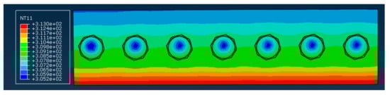 The amounts of paraffin considered in the model were 3%, 6%, and 9%. The quantity was increased by increasing the inner diameter of steel capsule, while other input parameters were kept constant. The temperature time histories of panels incorporated with various quantities of paraffin are shown in Figure 14. As the quantity of paraffin increased, the temperature on the top surface reduced during the phase transition of paraffin, and the lag time increased significantly, as summarized in Table 4. Thus, the amount of paraffin is an influential factor affecting the heat transfer of the mortar panel. Figure 15 shows the temperature contour plot of a panel with 9% of paraffin at 4000 s when the temperature difference with the control panel was at the maximum during the transient state. It could be observed that, as the diameter increased, less heat could be transferred to the core due to the low thermal conductivity of paraffin. The final temperature increased when the paraffin quantity increased due to the increased inner diameter of the steel capsules. The larger diameter of the steel capsules caused a larger amount of steel in the mortar panel and acted as the thermal bridge, thus resulting in a higher final temperature on the top surface. Therefore, the capsule material should be carefully selected when a high amount of paraffin is incorporated into the mortar panel. A material with a lower conductivity may be preferred compared to steel.