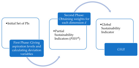 As previously mentioned, a two-phase procedure is proposed. In the first phase, following the proposal by [5], the composite indicator (sub-indicator) for each dimension of sustainability is calculated: (Partial Sustainability Indicator of dimension d). In the second phase, these partial indicators form the basis from which the overall composite indicator is obtained, applying a variant of DEA named the “Benefit-of-the-Doubt” approach. Figure 1 shows the general scheme of the proposed approach.