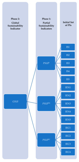 Taking into account the case study described above, Figure 2 displays a visual scheme of our methodological approach to evaluate the case of the Portuguese water companies. Let us assume that every initial indicator is already assigned to a dimension. Observe that Phase 1 entails designing partial sustainable indicators (), in order to analyze the situation of water companies for each particular dimension, based on the information provided by the corresponding initial indicators. Afterwards, Phase 2 summarizes the information provided by these into a global indicator ().