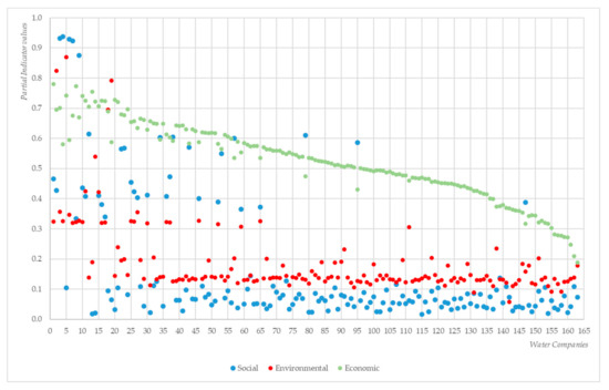 This study, therefore, presents a pioneering and novel approach to assess the sustainability of water companies. To the best of our knowledge, there is neither any theoretical development nor empirical application that uses composite indicators to assess and/or compare the sustainability of water companies, for each dimension of sustainability and for all the dimensions, simultaneously. Thus, the dimensional composite indicators, in the first phase, allow evaluating the strengths and weaknesses of each water company in a particular dimension. The global indicator, in the second phase, provides a holistic performance perspective, and allows ranking the water companies. However, it provides information about the contribution of the different dimensions to the sustainability overall score.