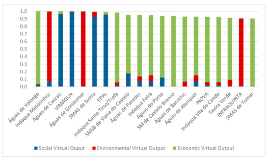 In relation to the weights obtained by solving Equation (7), Table 7 summarizes the maximum and minimum values for the virtual outputs obtained, as well as their mean and standard deviation for each dimension. The economic dimension, in general, is the one with the largest virtual outputs in the global aggregation. As the reader may observe in Figure 3, almost all water companies obtain similar (good) values in this dimension. On the contrary, the social and the environmental dimensions lose importance in the global weighting. The results show how some companies obtained very good results in these dimensions but, at the same time, a larger proportion of the companies obtained relatively poor results.