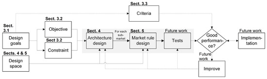 Figure 1 illustrates our design framework for local electricity markets, where each block corresponds to a section of this paper. It is based on an engineering design process of identifying goals, determining the design space, testing and evaluation [29]. This article focuses on the first two stages. Whereas previous studies focus on separate markets, we widen the scope to include the role of architecture and investigate the arrangement of sub-markets, as suggested by Stoft [27]. Accordingly, we divide the space into architecture design—choice and arrangement of sub-markets—and sub-market design that decides detailed trading rules.