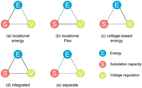 The linkage between sub-markets is “the heart of market architecture”, which naturally arises because of time, location and financial arbitrage [27]. Implicit linkages are common between sub-markets: in a DCDS, for instance, energy and voltage regulation markets are closely linked due to power–voltage coupling. Implicit linkages lead to information exchange and arbitrages between sub-markets. An explicitly-linked market [50], by contrast, integrates various commodities into one. Figure 2 lists all candidate sub-markets—energy, substation capacity and voltage regulation—and five possible linkages between them (solid lines for explicit linkages and dash lines for implicit ones).