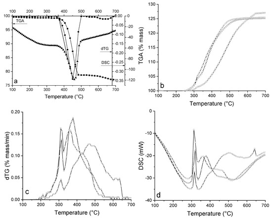 (a) (▪) TGA in % mass, (•) dTG in % mass/min and, (▴) DSC in mW, of lime A in air. (...) Marking onset of change in DSC. The results for the other limes were similar, and TGA in air for all limes can be found in [33]. (b) TGA of lime samples in 100% CO [33]. Re-printed from [33], which is licensed under a Creative Commons license (https://creativecommons.org/licenses/by-nc-nd/4.0/) (c) dTG of lime samples in 100% CO (d) DSC of lime samples in 100% CO In Figure 3b–d, the legend is as follows: (◯) Lime A, (▵) Lime B, (□) Lime C.