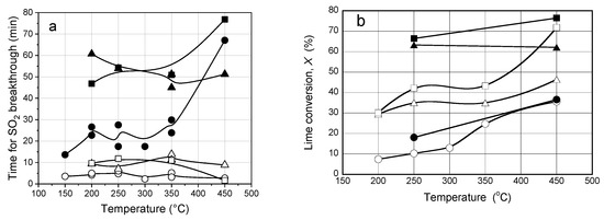 Figure 4a compares the time taken for the breakthrough of 10% and 90% SO with the temperature for the different limes. The 10% breakthrough times for lime A, B and C have been fairly constant with the temperature, with the exception of lime C at 450 C, which is much lower than that at other temperatures. In addition, lime B and C clearly have higher 10% SO breakthrough times compared to lime A. The breakthrough time for 10% SO is a measure of how well the SO would be captured if the residence time of lime is very low (about a few minutes) and it can be seen that limes B and C are better for low residence time applications (except lime C at 450 C). All the 90% SO breakthrough times for lime A are between 10–30 min, except at 450 C, where they are close to 70 min, much higher than at other temperatures. For lime B, they lay between 45–60 min, about five times higher than 10% SO breakthrough times for the same lime. In contrast to lime A, the 90% SO breakthrough times are fairly constant for lime B. For lime C, the breakthrough times for 90% SO are about 45–55 min for all temperatures except 450 C, where it is close to 75 min.