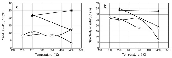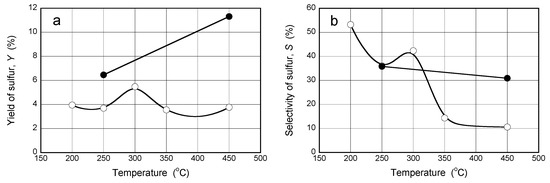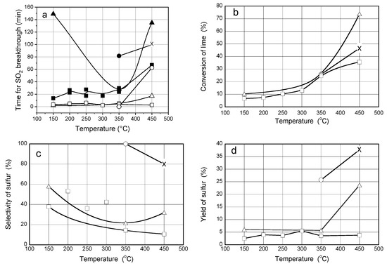 As seen in Figure 7d, the selectivity for 10% CO is higher than for 60%, for all three temperatures. We only have data at three temperatures for 10% CO, so we do not know if the performance between 200 and 300 C could be equally erratic for 10% CO as for 60% CO concentration. As expected, the sulfur selectivity is 100% in the absence of CO at 350 C. This is also reflected in the conversion of lime (Figure 7b) and the yield of sulfur (Figure 7c); they show the same value of about 25%. As shown in Equation (1), , when %, . At 450 C however, the selectivity is lower as the experiment was terminated at 84% SO breakthrough. The sulfated lime is thermodynamically more stable and unreactive in air but, the unreacted lime is still "available" for reaction and can be “infected” by CO from the air when sent to analysis. This affects the selectivity and therefore, lower selectivity is observed in Figure 7d. This is shown as a disparity in Figure 7b,c. The conversion of lime is higher than the yield of sulfur in the case of 0% CO at 450 C.