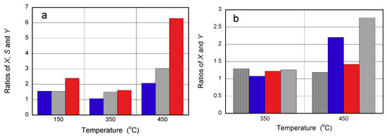 (a) Ratios of X (conversion of lime), S (Selectivity for sulfur) and Y (yield of sulfur capture) when dividing the values for the parameters at 10% CO by the corresponding values at 60% CO; (blue): X @10% CO/@60% CO; (grey): S @10% CO/@60% CO; (red): Y @10% CO/@60% CO; (b) Ratios of X (conversion of lime) and Y (yield of sulfur capture) when dividing the values of the parameters at 0% HO by the corresponding values at 25% HO for different CO concentrations; (black): X @0% HO/@25% HO for 0% CO; (blue): X @0% HO/@25% HO for 60% CO; (grey): Y @0% HO/@25% HO for 60% CO; (red): Y @0% HO/@25% HO for 0% CO. The experiments were conducted using lime A. The concentrations that are not specified in the figures are as per base-case experiments.