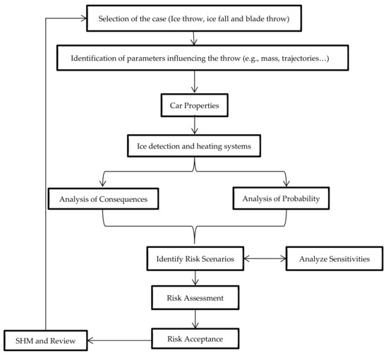 In Figure 2, the process of risk-based decision analysis in this case study is shown. First, it is necessary to consider the scenarios in an icing event to determine the influencing parameters, e.g., ice can be thrown away from the wind turbine when it is operating, or ice can be thrown away from the stopped or idling wind turbine. Furthermore, it has to be included that the wind turbine blade parts can be thrown away because of the partial or total failure of the blades. Next, the model is linked to a car passing on a highway near the wind turbine, and its properties, such as speed and number of passengers. Afterward, it is necessary to take into account possible ice detection and blade heating systems. Subsequently, risk scenarios are identified by the concept above for calculating risk, and in parallel, sensitive parameters in the model are identified. The calculated risks are compared with the accepted risks, and, using the ALARP (As Low As Reasonably Practicable) principle, risks can be considered to be acceptable or not. This process can be expanded using information from SHM (Structural Health Monitoring).
