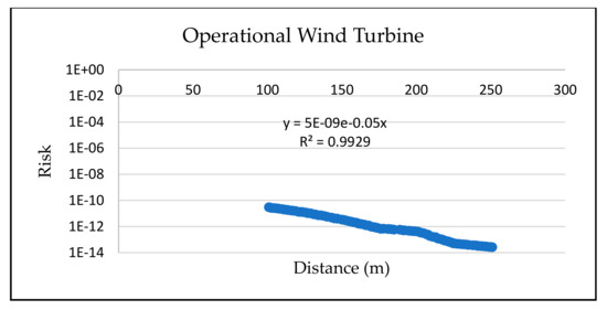 Figure 3. The risk R A , T O per year per kilometer due to icing events as a function of distance to the road for wind turbines in parked position, from [25].