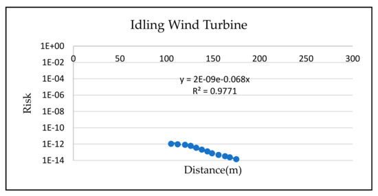 Figure 3 shows R A for ice throw from an operational wind turbine as a function of distance (d) to a road (in m) with the tower height of 100 m and the total height of 150 m. Approximately,