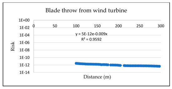 Figure 5. The risk R A , B T per year per kilometer as function of distance to the road for blade parts thrown away from the wind turbine, from [25].