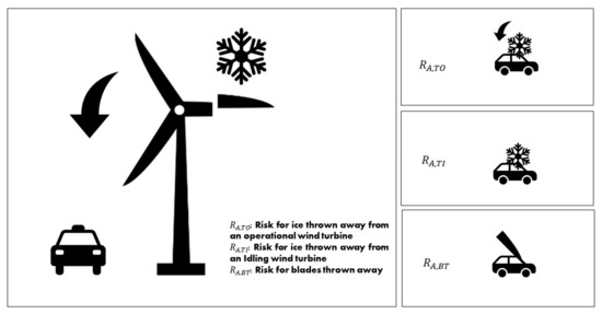 The reasons for wind turbine blade failures may be the extremely low strength of the materials (within random variations of strength parameters), manufacturing errors, maintenance errors or extreme environmental conditions (within random variations of environmental parameters and accounting for the effect of the control system). Ice throw can be considered to be similar to a slingshot effect. Ice may be blown from the rotor blades in cases with strong wind when the wind turbine is parked or idling, or thrown away when the wind turbine is in operation. In a risk assessment, mechanical and electrical failures may lead to blade or blade fragment failures; fire and ice risks may be considered as similar events with the main difference between them in the risk assessment being related to their frequency of occurrence [13]. An icing event of a wind turbine near a highway is depicted in Figure 1.