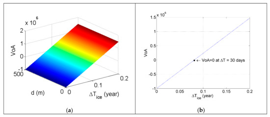 Following Equations (8)–(12) and Table 1 and Table 2, the computational results of VoA are shown in Figure 10. When VoA < 0, it means that it is not worthwhile installing the heating system. When VoA > 0, it is recommended that the heating system be installed. Based on Figure 9a, the VoA will increase with the increase in downtime, which means that it will be more beneficial to install the heating system if the downtime due to icing on the blades is longer. However, the impact of the distance of the wind turbine from a highway d is comparably small, which can be explained by the low variation of risk model independence of distance in Section 5. The critical downtime in the case study when VoA = 0 is at T = . 30 days, as shown in Figure 9b. Therefore, if the down time due to ice on the blades is less than 30 days, it is beneficial to just shut down the wind turbine instead of installing a heating system. If the downtime is longer than 30 days, it is worthwhile installing the ice heating system on the blades.
