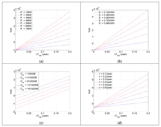 Figure 10. Parametric analysis regarding Value of Action (VoA) with respect to the power of the wind turbine (a), electricity price (b), cost of the heating system (c), and number of icings per year (d).