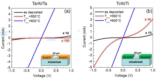 The I–V characteristics of the contacts showed a non-linear behavior after deposition. Figure 1 shows the I–V curves acquired on Ta/Al/Ta (Figure 1a) and Ti/Al/Ti (Figure 1b) TLM structures at different annealing temperatures. The curves are measured between contact pads placed at a distance of 20 µm. As can be seen, both contacts exhibit a rectifying behavior after deposition and after annealing at temperatures up to 550 °C. The ohmic behavior is reached after annealing at 600 °C.