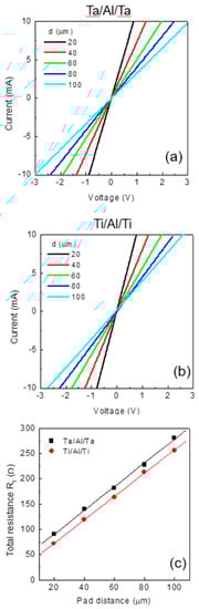 The I–V curves acquired on TLM structures in both Ta/Al/Ta (600 °C, 180 s) and Ti/Al/Ti (600 °C, 60 s) are shown in Figure 2a,b, respectively. As can be seen, linear characteristics are observed in both cases, with the current decreases with increasing TLM pad distance. Moreover, Ti/Al/Ti contacts show a higher current level. From the slope of these curves, it was possible to extract the total resistance RTOT. In particular, Figure 2c reports the plot of the total resistance RTOT measured as a function of the distance d between adjacent TLM pads, showing a linear increase in the resistance.