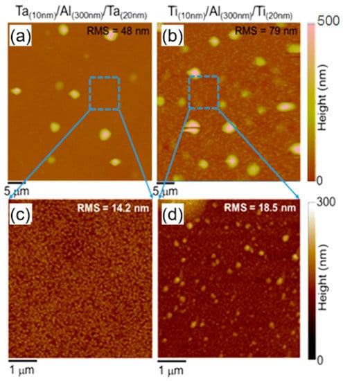 In order to explain these differences and to understand the mechanism of ohmic contact formation in the two systems, a morphological and structural characterization of the samples was carried out. Figure 3a,b show the morphologies of the Ti/Al/Ti and Ta/Al/Ta contacts annealed at 600 °C, acquired on a 40 µm × 40 µm region. In both cases, the surface is characterized by flat areas with some isolated hillocks, leading to root mean square (RMS) roughness values of 48 nm and 79 nm for Ta- and Ti-based contacts, respectively. These hillocks are more pronounced in the case of the Ti/Al/Ti system, thus justifying the higher RMS value. Figure 3c,d show the AFM images acquired on the flat areas on a 5 µm × 5 µm region. Interestingly, also in the flatter areas the Ta/Al/Ta contacts exhibited a lower roughness (RMS = 14.2 nm) with respect to the Ti/Al/Ti samples (RMS = 18.5 nm).