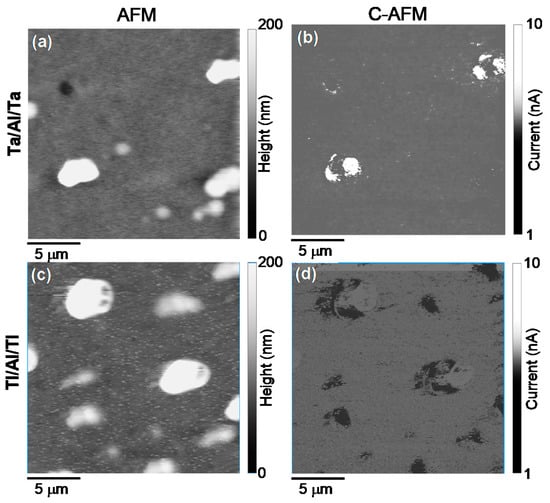 AFM image and Conductive Atomic Force Microscopy (C-AFM) map acquired on contacts: (a) AFM image and (b) associated C-AFM map acquired on Ta/Al/Ta contact. (c) AFM image and (d) associated C-AFM map acquired on Ti/Al/Ti contact. The images were acquired on 20 µm × 20 µm scan areas.
