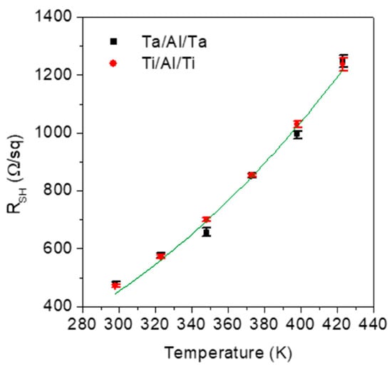In our case, according to Hall measurements, the 2DEG density ns did not show significant variations with temperature, as commonly reported in literature for AlGaN/GaN heterostructures [26]. Hence, the temperature dependence of RSH is mostly related to the carrier mobility. Accordingly, RSH could be fitted using a power-law expression, like , typically used for the temperature dependence of 2DEG mobility () [27,28]. The fit of the experimental data, reported as a continuous line in Figure 6, returned a value of β = 2.87, which is consistent with the dominance of the optical phonon scattering mechanism [6,26].