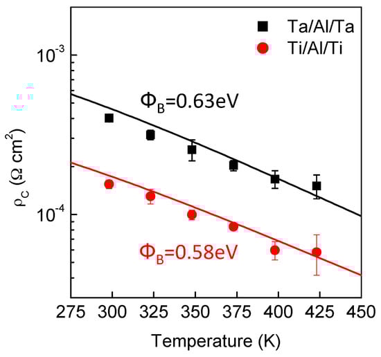 Temperature dependence of specific contact resistance ρC for the Ta/Al/Ta (squares) and Ti/Al/Ti (circles) contacts annealed at 600 °C. The lines represent the fits of the experimental data with the thermionic field emission (TFE) model (Equation (2)).