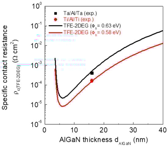 Figure 8 reports the specific contact resistance ρc versus the AlGaN thickness (dAlGaN) for Ta/Al/Ta and Ti/Al/Ti ohmic contacts on AlGaN/GaN heterostructures, calculated using the TFE-2DEG model.