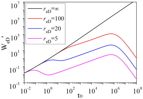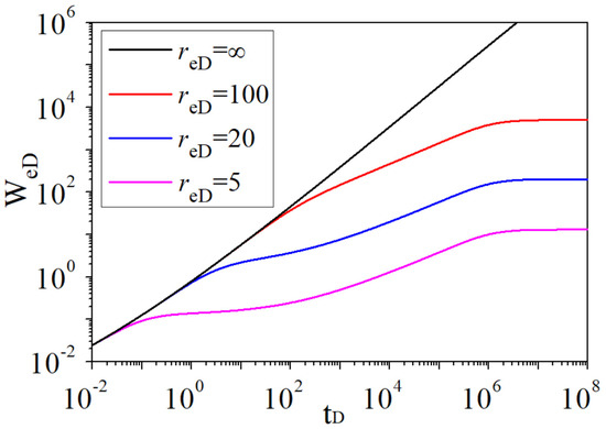 - For infinite edge water, the outer boundary condition isIts seepage equations, initial conditions, and inner boundary conditions are consistent with the finite aquifer. Thus, the dimensionless water influx in the Laplace domain can be obtained by