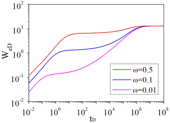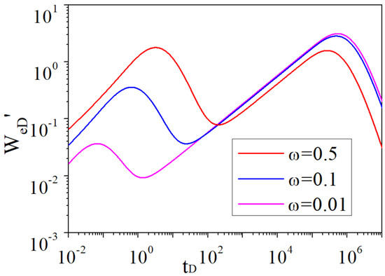 - With the decrease in the storativity ratio ω, the “V-shape” in the derivative curve appears earlier, and the difference in height between the double steps in the dimensionless water influx curve is greater.