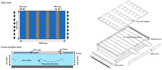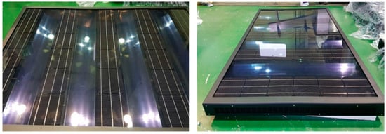 In previous studies, PVT collectors consisted of PV cells throughout the front side [3,5,19]. Also, baffles were fitted inside the collector, mainly to extend the flow path of the heat medium to increase the thermal performance. In this study, a new air-based PVT collector was proposed and designed to address one of the challenges of PVT collector performance between thermal and electrical yield, as shown in Figure 1 and Figure 2. The glass-to-glass type PV module was attached to the front of the PVT collector and was also designed to capture more solar heat inside the collector by maintaining a constant gap between the PV cells. Inside the PVT collector, four equally spaced heat absorbing plates with high thermal conductivity were installed between the PV cells. The plates were made of aluminum (with a length of 980 mm and a width of 194 mm) with a highly selective blue coating and were designed to directly harness solar radiation coming in through the glass surface. The heat absorbing plate installed inside the PVT collector was designed as a round shape to obtain more solar radiation by increasing the area of the absorber, such that the internal temperature of the collector could be increased to improve the thermal performance. The plates were located in the air cavity behind the glass-to-glass PV module, such that air could circulate above and below the thermal absorbers. Moreover, the bending shaped plate was considered to act as a baffle, lengthening the air flow path inside the collector and creating turbulence in the collector. Consequently, the heat transfer of the collector increases and the surface temperature of the PV module reduces. By maintaining a lower temperature for the PV module, the degradation of PV power from temperature rise can be prevented. The area of the PVT collector was 1.63 m2 and detailed specifications of the attached PV module are shown in Table 1.
