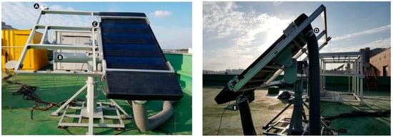 The developed PVT collectors were evaluated based on ISO 9806:2017, as mentioned before. The collectors were installed on a 2-axis tracker with horizontal (0 to 160°) and vertical (15 to 90°) angle adjustments (see Figure 3) in Cheonan, Republic of Korea (36.815° N, 127.114° E). The tracker was set such that the PVT was always directly normally aligned with the sun. To evaluate the thermal performance of the air-based PVT collector, parameters such as the temperature and flow rate at the inlet and outlet, the solar irradiance, and the outdoor temperature were measured at 10 s intervals. Further, to analyze the electrical performance of the collector, the PV power, maximum and open-circuit voltage, and the current were also measured. The experiment was conducted at a solar radiation amount of 700 W/m2 or more, in accordance with the test method of ISO 9806:2017. The experiment was conducted from November to December in 2017. The data were collected when the solar radiation amount, the flow rate, the temperature at the inlet and outlet, the outdoor temperature and the surrounding air speed were in steady state. The data were measured when the steady-state conditions within the ranges given in Table 2 were met [18]. The specifications and uncertainty values of the instruments used are presented in Table 3.